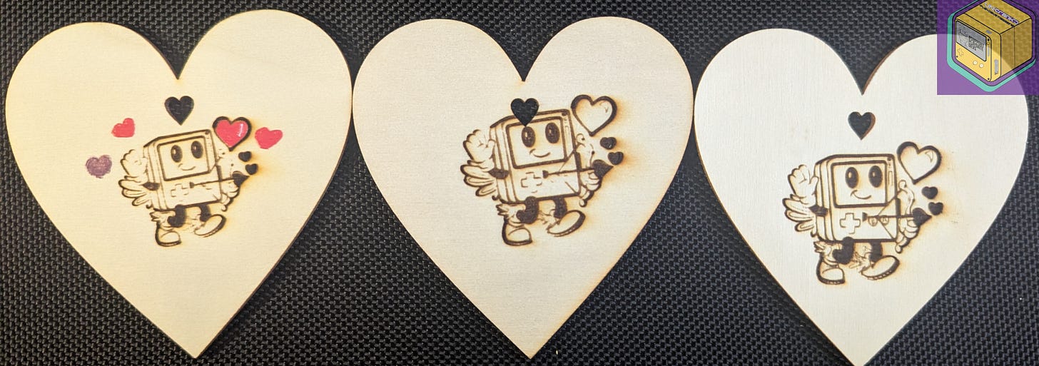 Sadly, this idea came to me a little late, so I doubt they’ll arrive by Valentine’s Day with current shipping delays. But if you’d like one, let me know — the finished laser‑engraved heart (right) is the final version, and I still have 6 left. The design is engraved on both sides.